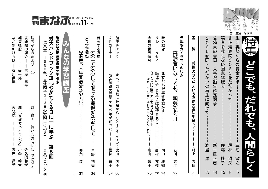 2014年9月号特集 労働組合の存在意義を問う 労働組合の組織率の低下は目を覆うばかりです。その内、連合路線=労資協調路線ではなく、真に資本と闘う労働組合は一体どれくらい有るのだろうかというと本当に心もとない。この現実がブラック企業の蔓延を許し、雇用不安を招き、過労死やうつ病などの健康破壊を招いています。この実態から目をそらすことなく、困難ではありまが一歩一歩、労働運動の再生に向けて地道に努力を続ける以外に道はありません。 |