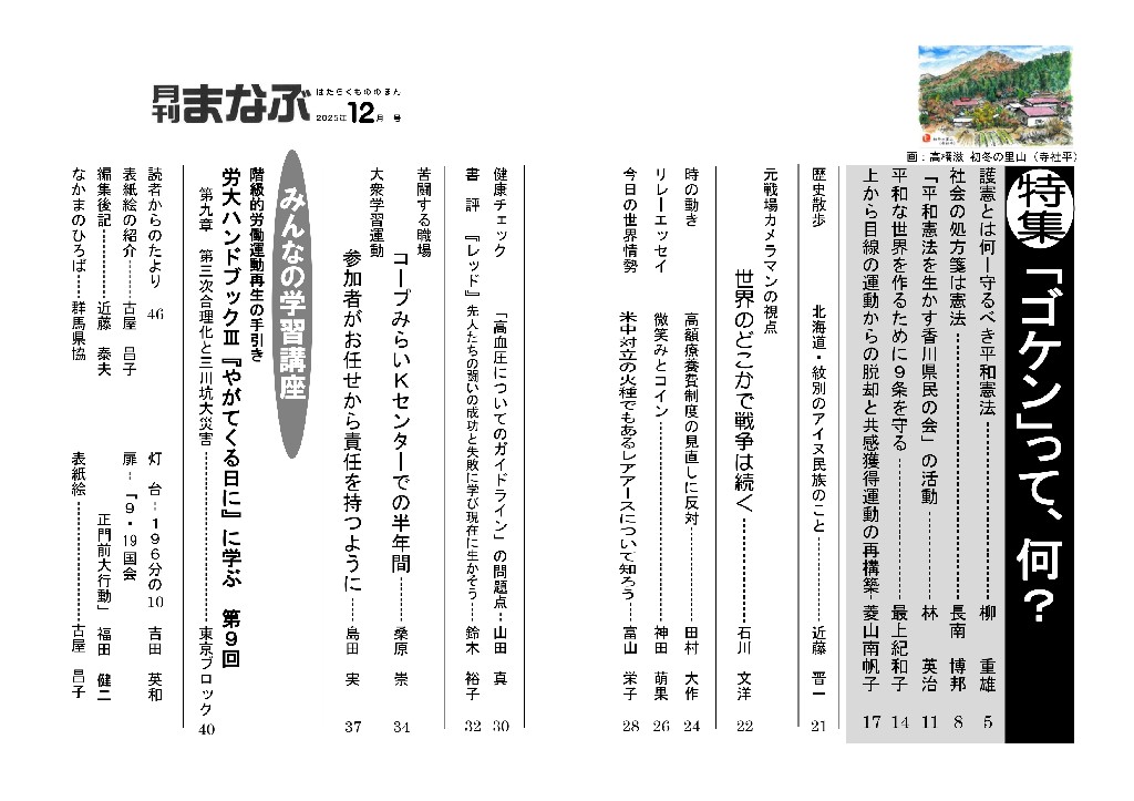 2015年2月号特集 「地方創生という欺瞞を暴く」 今日本の地方は疲弊しきっています。地方都市に広がるシャッター通り、山間部での限界集落の増加、過疎化は進む一方です。ローカル線の廃止を初め、地方のお年寄りの生活基盤は奪われ続けています。政府は地方創生を掲げ、担当大臣も置くなど一見力を入れているように装っています。しかし、政府が本当に力を入れているのは、戦争の出来る国づくりです。資本の要請が最優先です。地方創生という甘言に騙されてはいけません。 |