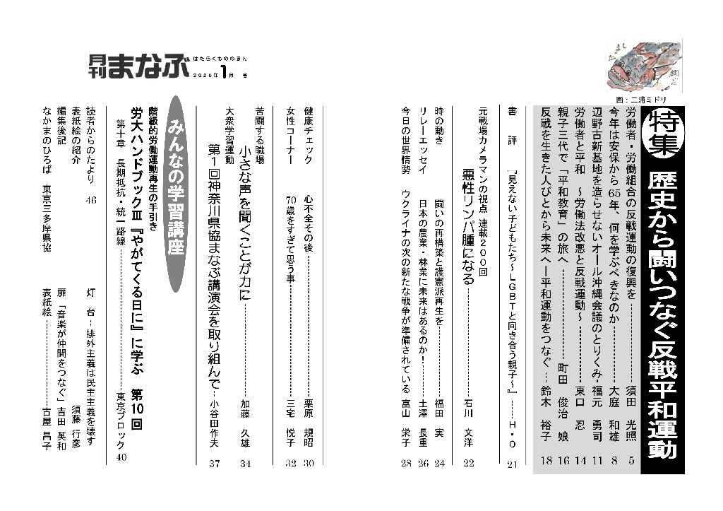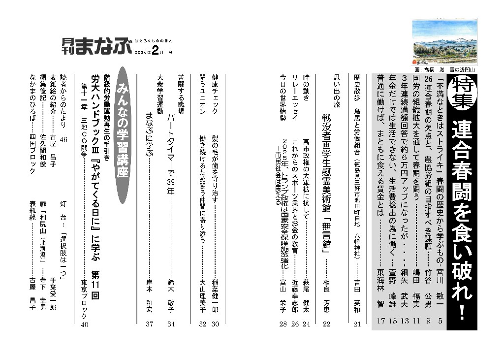 2018年2月号 特集 春闘の再構築を 今年も春闘の時期になりました。しかし、春闘という言葉が新聞やニュースに載るのは、もっぱら官製春闘という言い方だけです。70年代、80年代に使われていた、本当の意味での春闘は何処に行ってしまったのでしょうか。 労働者が資本を相手に、ストライキで闘い賃上げを勝ち取る、それが春闘です。政府が資本にお願いをして、「おこぼれ」をもらうような春闘であってはなりません。 容易ではありませんが、本来の意味での春闘を取り戻すため、団結して頑張りましょう。 |